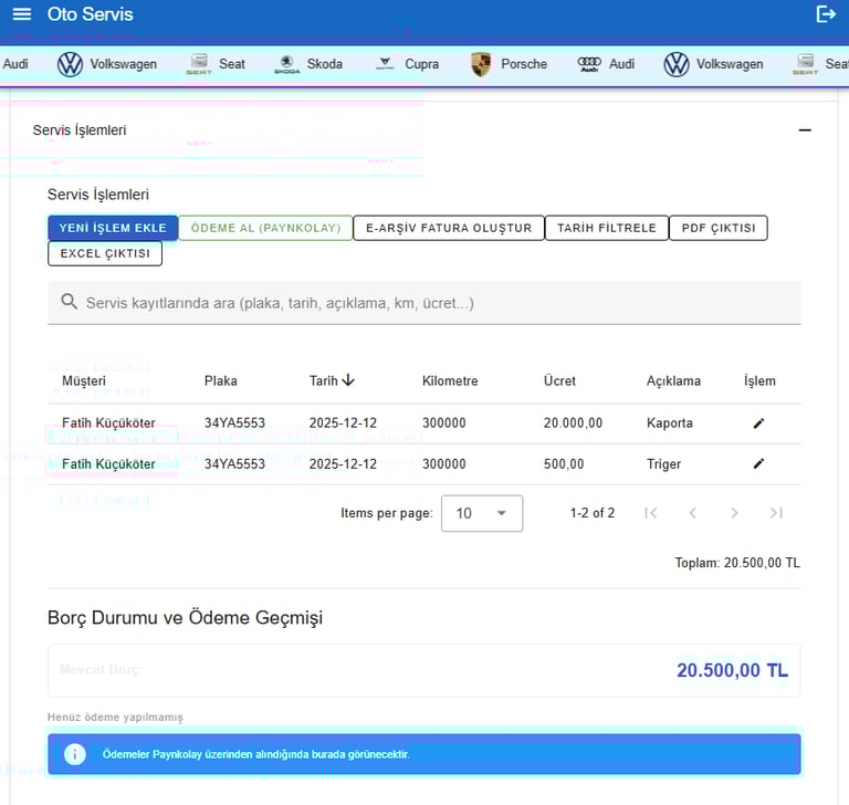 Servis süreçlerinizi tek panelden kolayca yönetin, müşteri iletişimini ve iş takibini dijitalleştirerek zamandan tasarruf edin.Taksitli Sanal Pos ödeme yöntemi ile hem cironuzu arttırın hem de müşteri memnuniyetinizi.E-fatura oluşturarak muhasebe süreçlerinizi kolaylaştırın.Bu sayede işlerinizin yönetiminde vitesi arttırın.